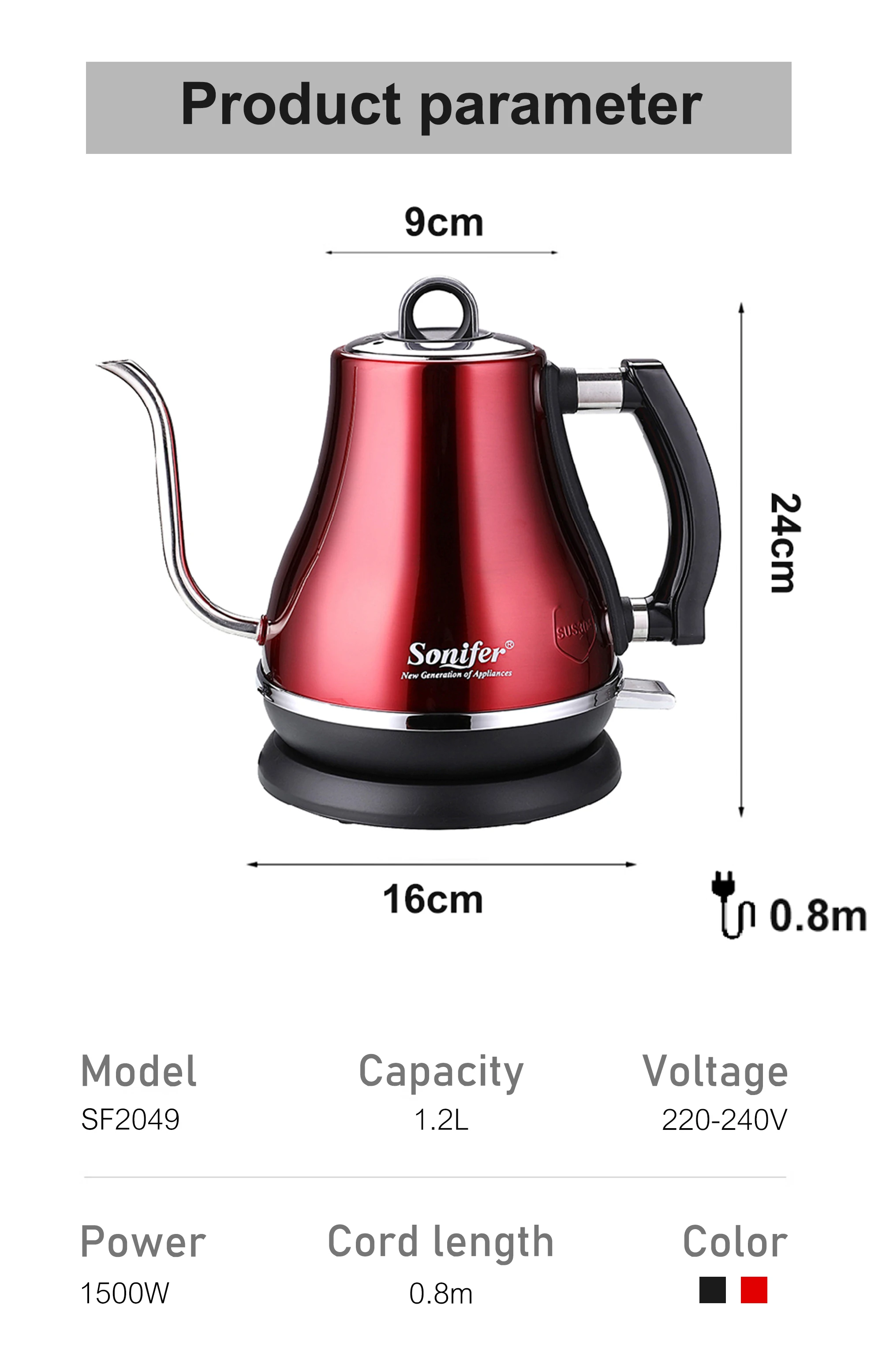 1.2L Gooseneck Electric Kettle Tea Coffee Thermo Pot Appliances Kitchen Smart Kettle Quick Heating Electric Boiling 220V Sonifer
