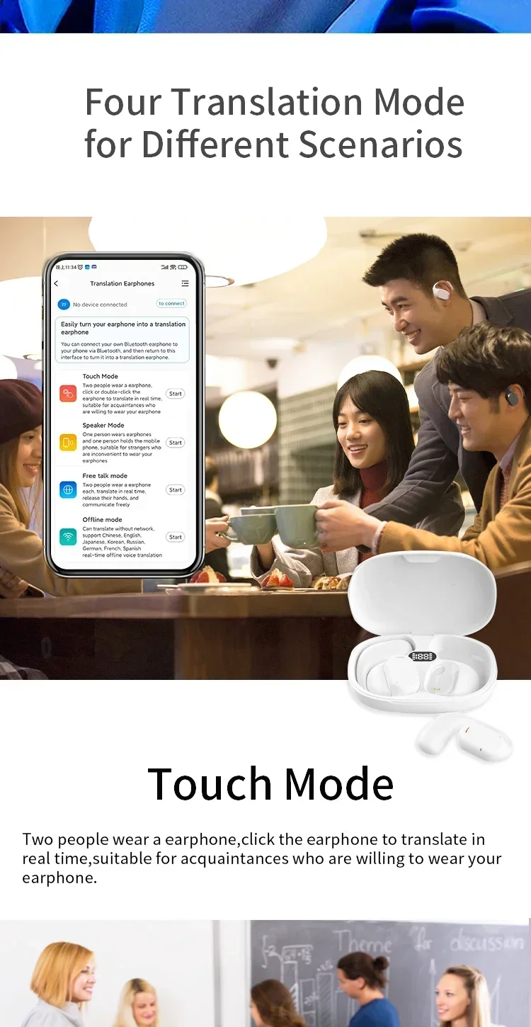 [Innovative Five translation modes for any scene] With five different translation modes, including touch mode, speaker mode, Free talk mode, offline mode and photo translation, this earbud can meet all your communication needs. From business meetings to casual conversations, the B66 Translation headset guarantees clear and effective communication, ensuring you don't miss a beat.