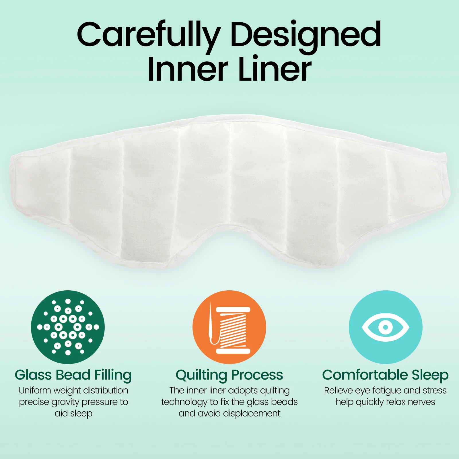 High Density Glass Bead Filling : The inner liner is filled with high density glass bead particles , which distribute weight evenly . Through natural gravity , it gently presses on the acupuncture points around the eyes , relieving eye fatigue and pressure . The gravity pressure also blocks external disturbances more effectively